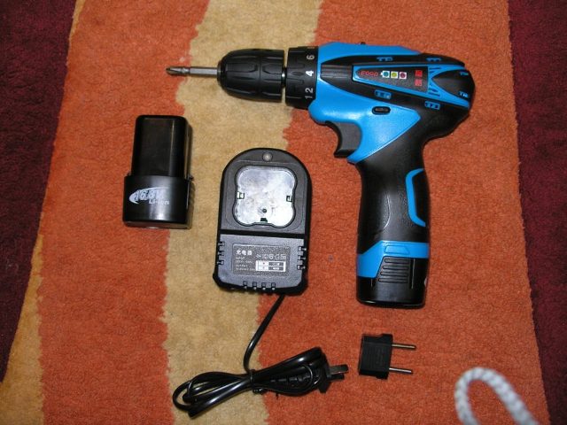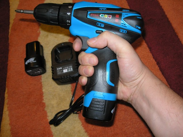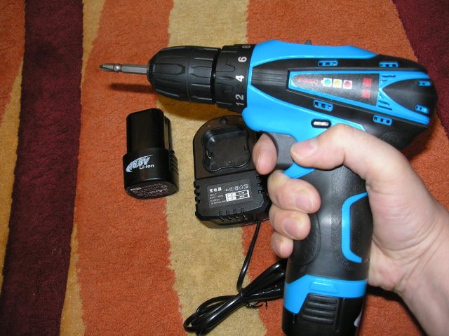 Как обычно имеются две скорости, вращение по часовой и против, 18 ступеней + сверление. А также есть функция светодиодной подсветки рабочей зоны и степени заряда аккумулятора (три светодиода сбоку на шуруповёрте). При зарядке на блоке питания горит красный светодиод, по окончании он же горит зелёным.