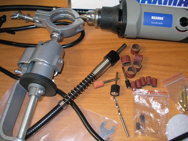 Также в наборе за небольшие деньги идет гибкий привод с держателем, кронштейн для крепления и минимальный набор насадок.