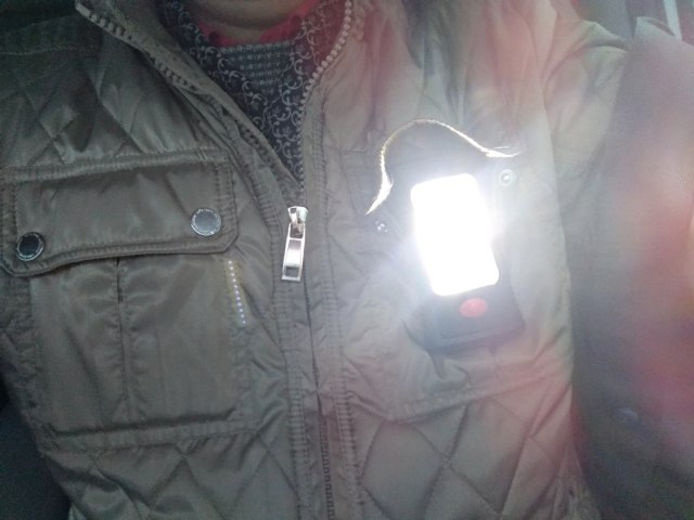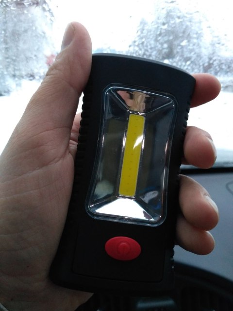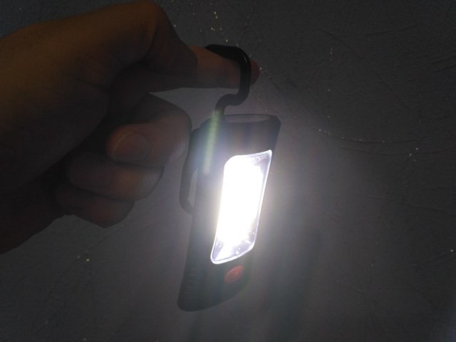 Очень компактный фонарик. С двухсторонним светом. С лицевой стороны светит большой светодиод, на котором можно сосчитать 11 кристаллов. И с торца фонарь светит тремя небольшими светодиодами. Кнопка Соответственно имеет три позиции. Фонарик снабжён магнитом, закреплённым на поворотной части корпуса. Который надёжно держит фонарь на металлической поверхности.